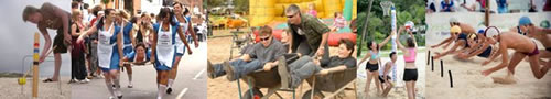 Activities include: croquet, wheel barrow race, beach netball, stretcher race, bocce.